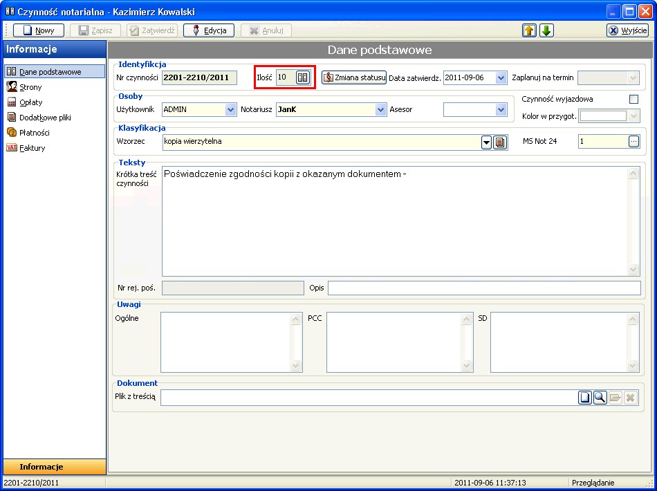 gdzie istnieje możliwość wprowadzenia ilości czynności występujących pod jednym wpisem w Repertorium A.