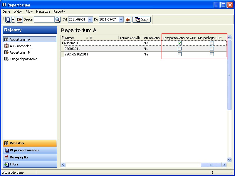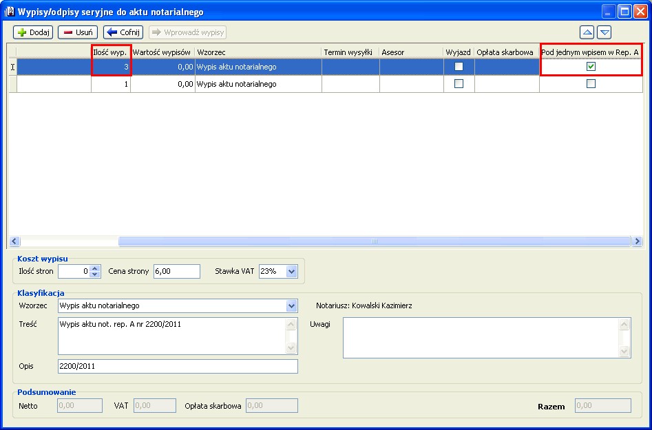 W przypadku okna za pomocą którego tworzone są wypisy seryjne do aktów notarialnych można określić, czy tworzone wypisy dla jednej strony będą zapisane pod jednym wpisem w Repertorium A: