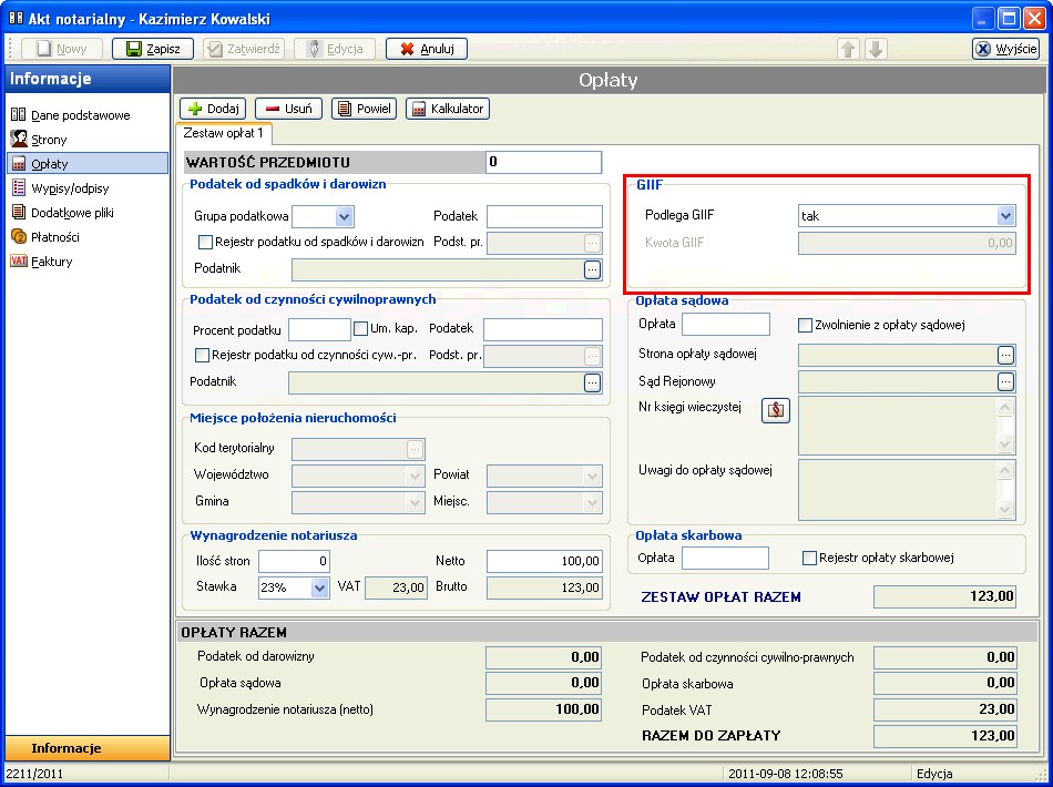 Na zakładce Opłaty kwoty te zostaną przemnożone przez podaną Ilość czynności notarialnych dla danej pozycji repertorium.