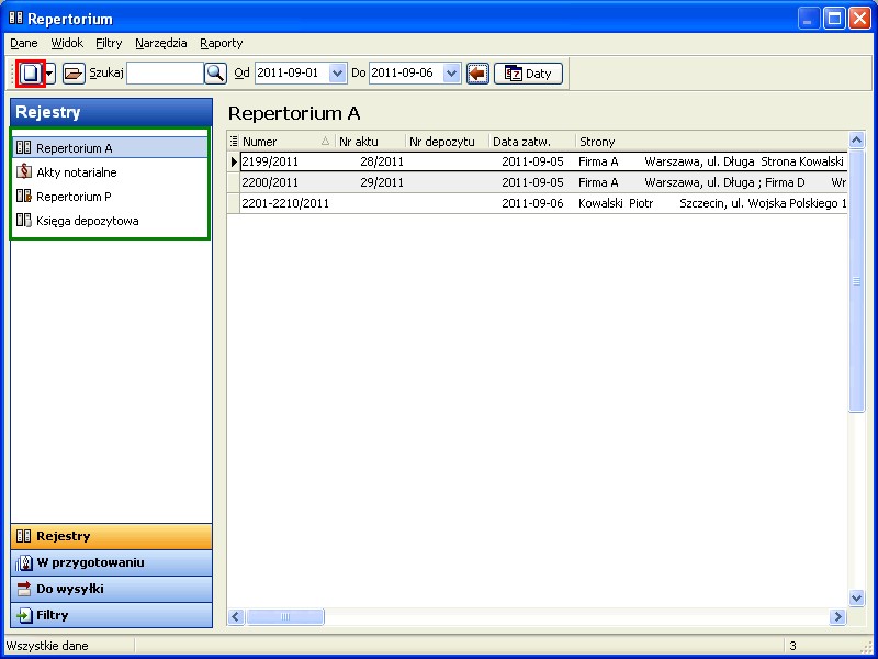 Kliknięcie na przycisk oznaczony kolorem czerwonym tworzy czynność notarialną w zależności od miejsca w module repertorium, które jest wybrane w panelu wyboru oznaczonym kolorem zielonym. Tzn. jeśli będzie np. wybrane Repertorium P, to kliknięcie na przycisk nowej czynności będzie skutkowało wejściem w okno tworzenia nowej pozycji Repertorium P.