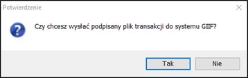 Taki plik z transakcji pojawi się w oknie transakcji wysłanych, jednak ze statusem pliku odrzuconego. Należy raz jeszcze zaznaczyć plik i wybrać opcję wyślij ponownie, jednak po wyświetleniu się pytania o przesłanie pliku do GIIF wybrać opcję NIE.