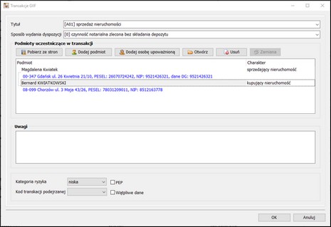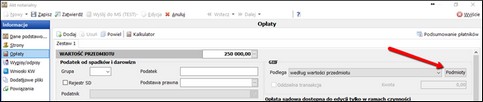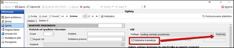 Jeżeli któryś z zestawów opłat czynności zostanie oznaczony jako osobna transakcja, spowoduje to pojawienie się w zestawie przycisku Podmioty, w którym niezależnie definiowane będą dane dla kolejnej transakcji GIIF.