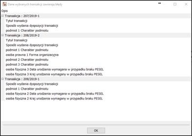 Wszystkie dane transakcji są weryfikowane według wymagań GIIF. O braku jakichkolwiek wymaganych danych (patrz rysunek powyżej) użytkownik zostanie powiadomiony w oknie weryfikacji. |