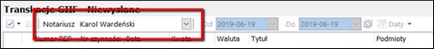 Pierwszym krokiem przed przystąpieniem do tworzenia transakcji w module GIIF jest wybranie notariusza, dla którego chcemy tworzyć transakcje. Jeżeli w bazie programu jest tylko jeden notariusz, zawsze będzie on wskazany w polu notariusz. Jeżeli w bazie jest podanych więcej notariuszy, konieczne będzie rozwinięcie pola wyboru i wskazanie właściwego notariusza.