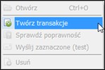 Po wybraniu notariusza należy skorzystać z przycisku Twórz transakcje w zakładce Dane, lub będąc kursorem myszy w polu listy transakcji, nacisnąć prawy przycisk myszy i z wyświetlonego menu także wybrać opcję Twórz transakcje.
