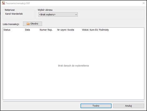 Otworzy się okno tworzenia transakcji GIIF, w którym wyświetlane są informacje: o notariuszu, dla którego będą tworzone transakcje, pole z możliwością wyboru okresu za który mają zostać tworzone transakcje (domyślnie zakres dat jest pusty), oraz pole z listą transakcji z opcją ich otwarcia.