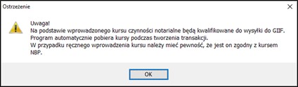 Możliwe jest wcześniejsze wprowadzenie ręczne kursu w sytuacji, gdy danego dnia nie była jeszcze ogłoszona przez NBP tabela kursów. Jednak przy takiej operacji użytkownik otrzyma ostrzeżenie:
