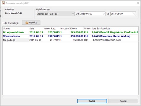 Po wyborze okresu, za który mają zostać utworzone transakcje, program wyświetli czynności z tego okresu i na podstawie kursu Euro określi status transakcji. W czynności jest możliwe podanie wartości przedmiotu od razu w kwocie Euro. Zostanie ona wyświetlona przy transakcji i na podstawie jej wartości odpowiednio zostanie oznaczony jej status.