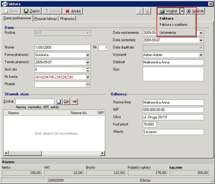 | • | Podczas wydruku faktur generowanych wg płatników wydruk jest generowany odpowiednio wg ustawień faktury, tzn. albo z szablonu RTF, albo jako domyślny wydruk programu |