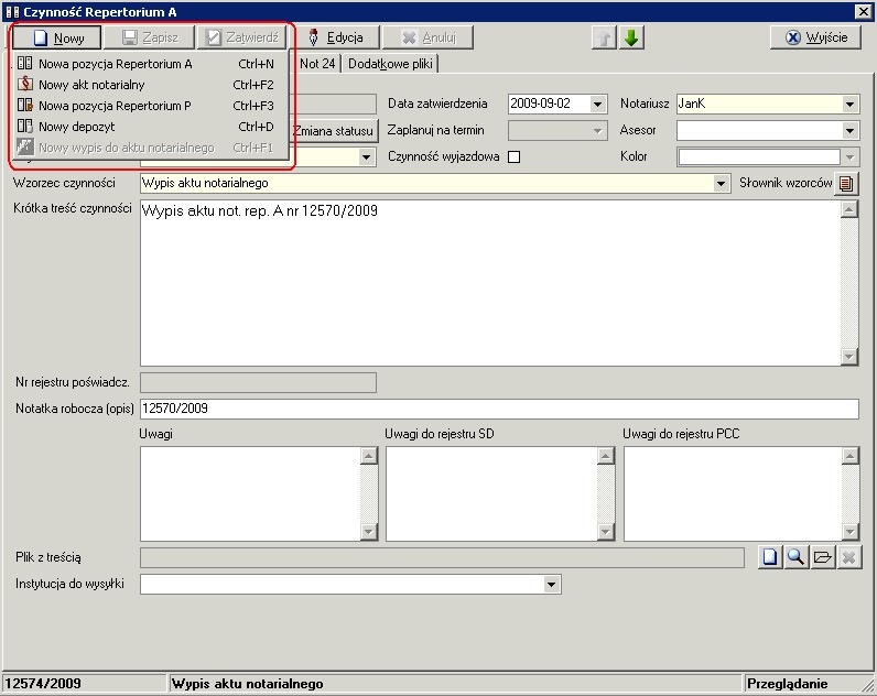 | • | wprowadzenie przycisku "Rejestruj", za pomocą którego można od razu (z pominięciem fazy "w przygotowaniu") umieścić czynność/akt w reprtorium (Pozycja repertorium (czynność)/Akt notarialny) |
