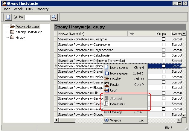 Opcja dostępna pod prawym przyciskiem myszy w Słowniku stron/instytucji |