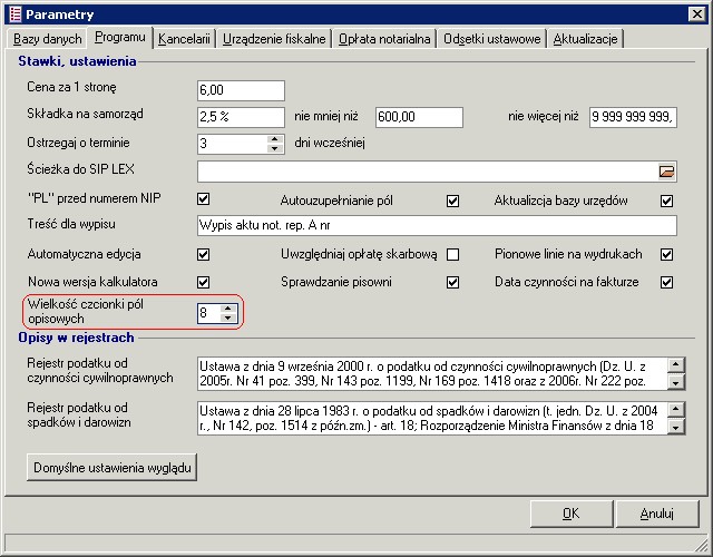 | • | Usunięto opis 22% w kulumnie Podatek VAT wydruku Repertorium A oraz umożliwiono wybór różnych stawek w Opłatach czynności notarialnej. |