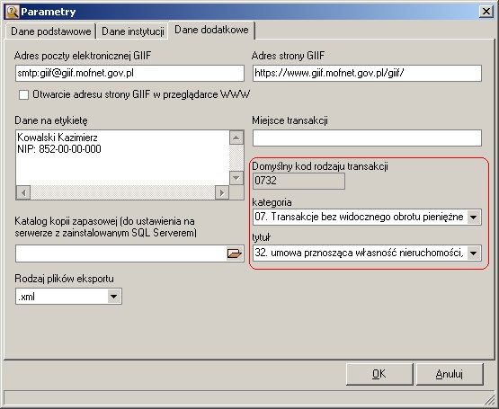 | • | W Rejestrze Transakcji GIIF w parametrach na zakładce Dane dodatkowe wprowadzono pole Miejsce transakcji, które pokazuje się, gdy jest używany program bez pełnego pakietu Kancelaria Notarialna. |